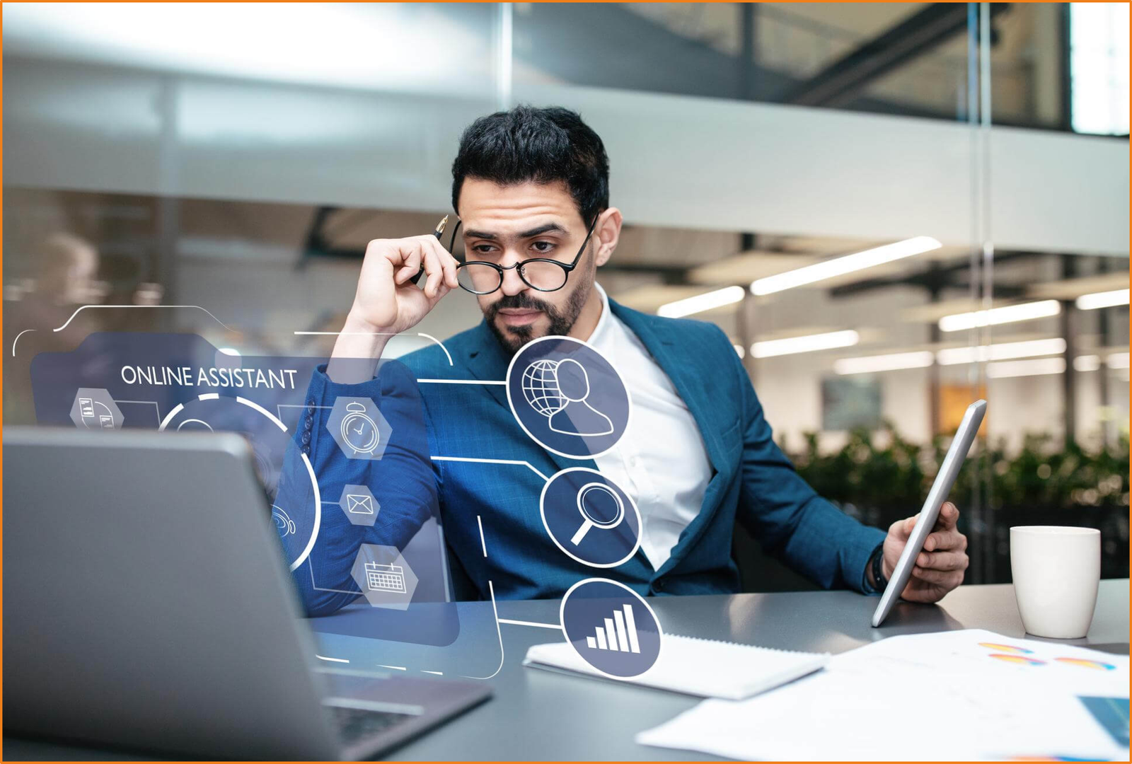 A person typing on a laptop in a bright, modern office setting, showing productivity and technology.